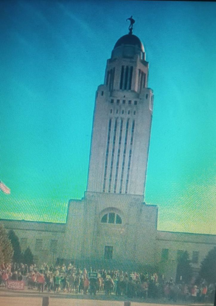 Nebraska State Capitol, Democratic Party of city of Lincoln, Nebraska/Lancaster County, Nebraska. Streaming & pic by Joseth Moore. Sunday, November 6, 2022.