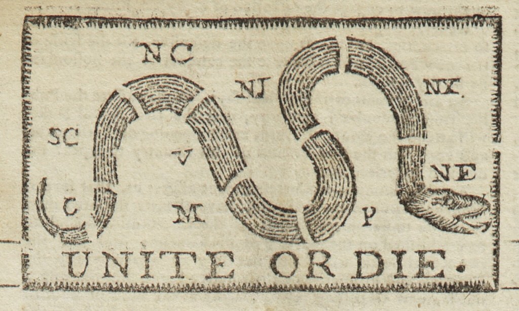 (Image: a slight variation of Benjamin Franklin’s political cartoon of “JOIN Or Die,” snake [1754; the National Constitutional Center]. )