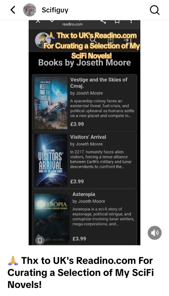 🌒 Thx to UK’s #Readino .com For Curating a Selection of My #SciFi Novels! – JosethMoore : #LunarLegends , #Asteropia , & #VisitorsArrival = #TheLunarSeries . #VestigeAndTheSkiesOfcMaj . #TheSolarBridge . #ScienceFiction #Science , #TimeTravel , #Aliens , #Space , #ONeillCylinder – #GenerationShip , #Robots & #Ai , #ArtificialIntelligence , #Planets #moons & #asteroids . #USA #EU #UK #Global